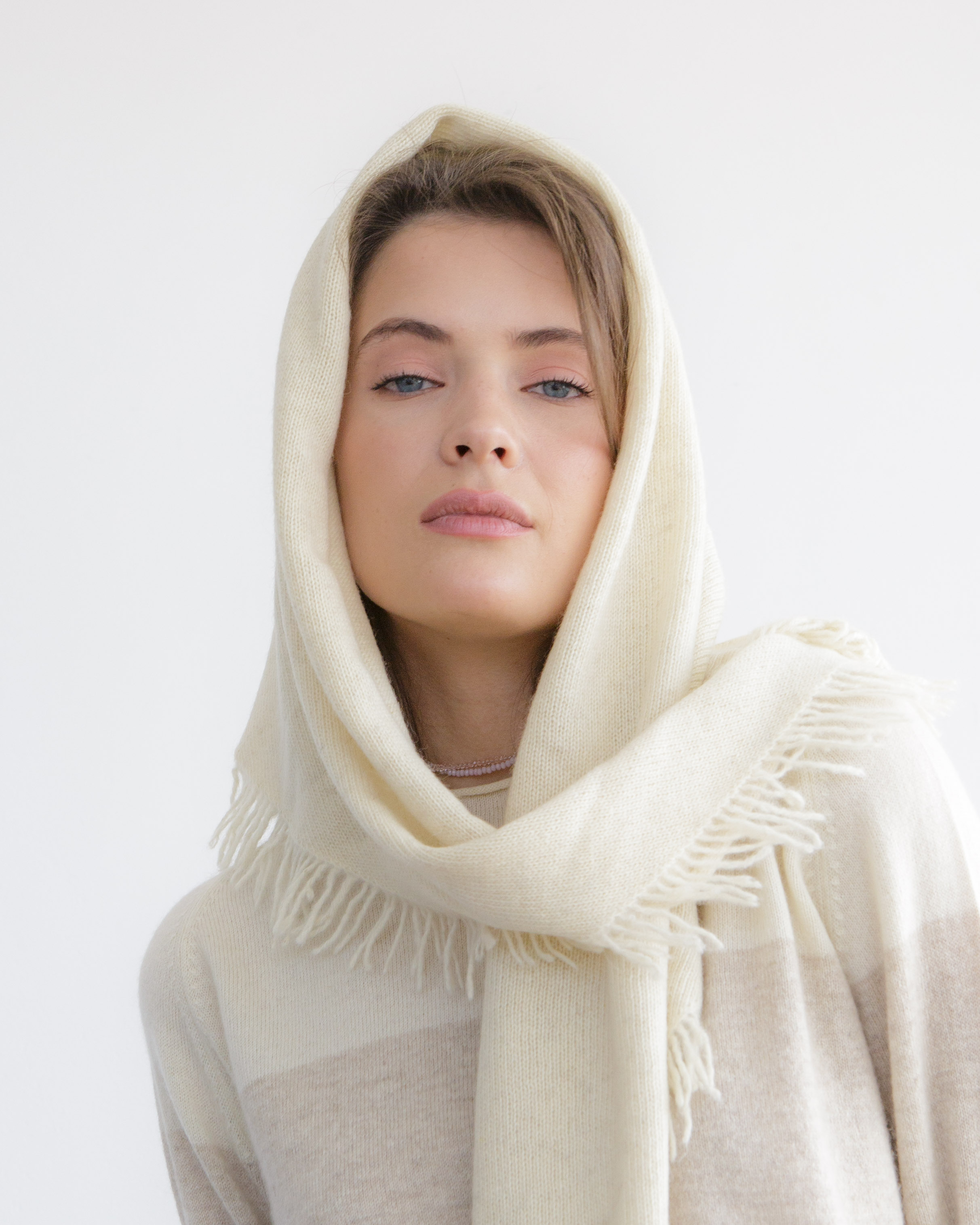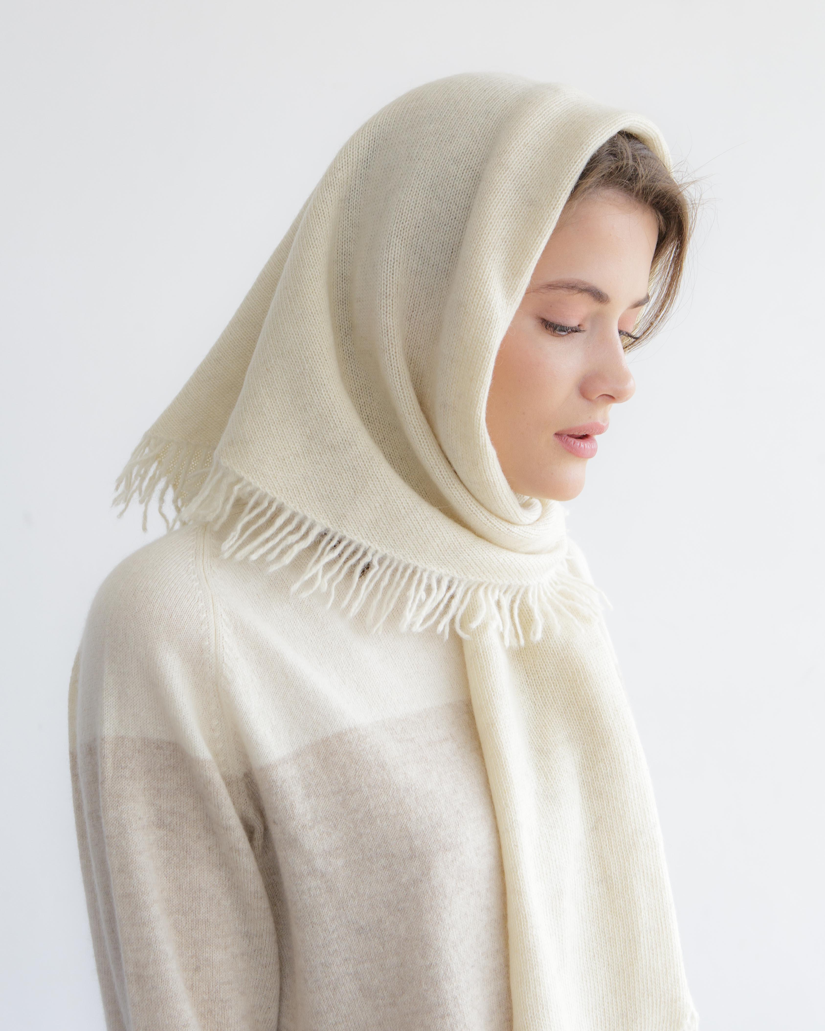 Косынка легко драпируется и может носиться как на голове, так и на плечах или шее. Минималистичный дизайн подчёркивает натуральную фактуру материала и универсальность модели.