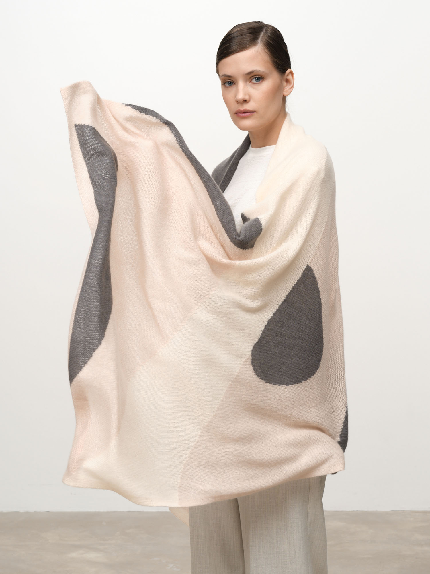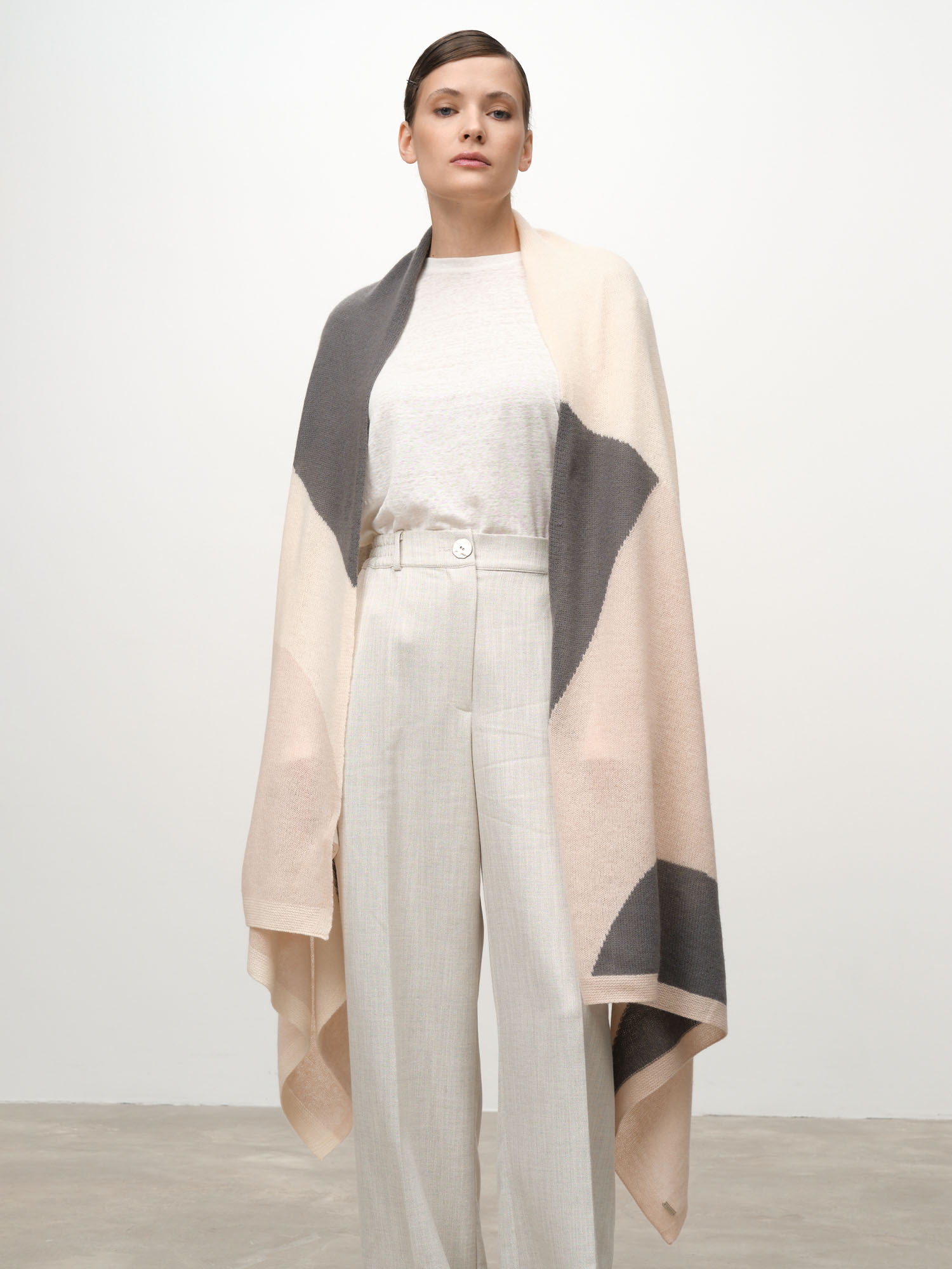 Модель выполнена в формате широкого палантина с лаконичным минималистичным рисунком. Контрастные декоративные элементы создают современный графичный эффект и подчёркивают стиль изделия.