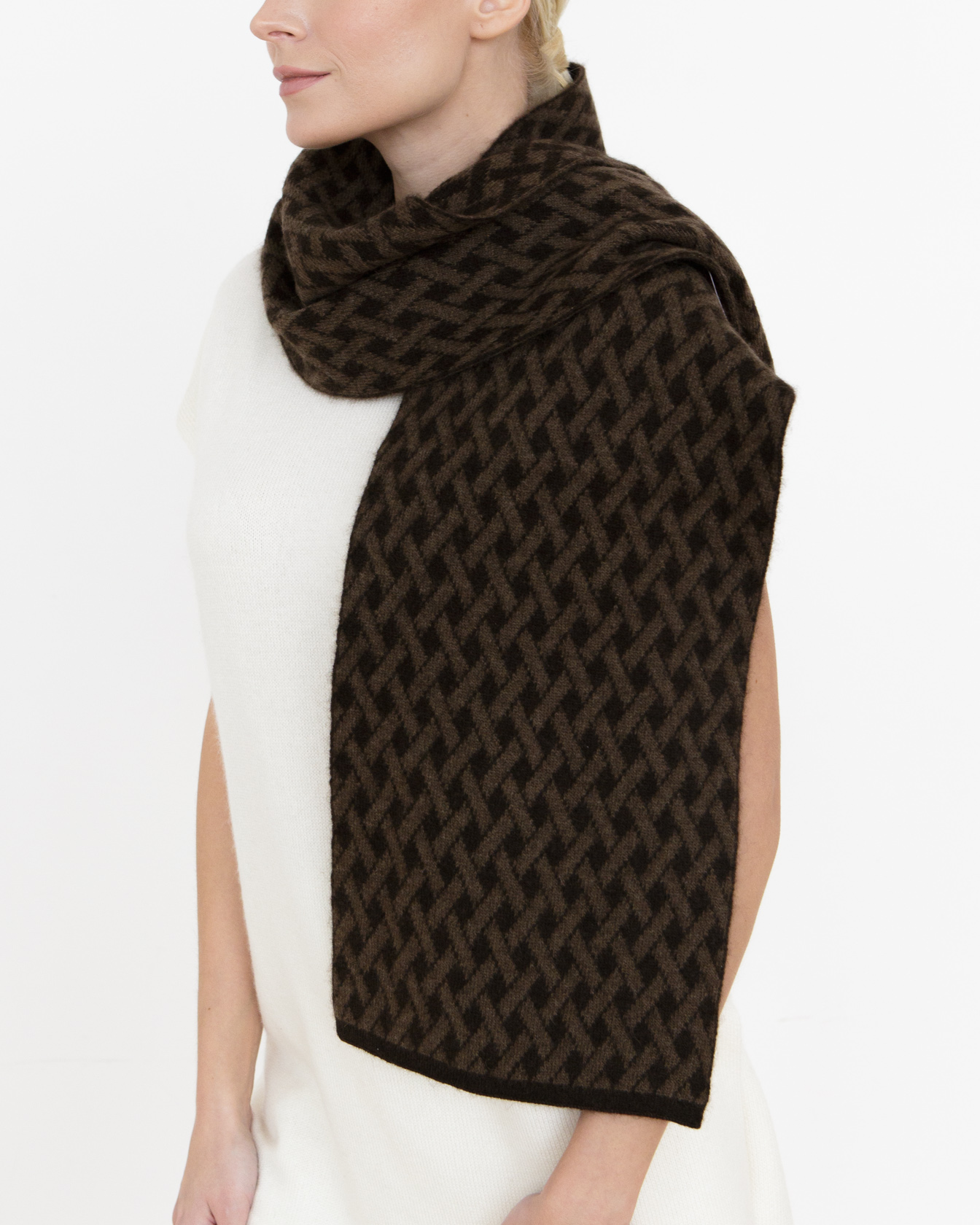 Темно-коричневый с контрастным бежевым узором — благородное сочетание натуральных оттенков, которое легко комбинируется с базовой палитрой гардероба.