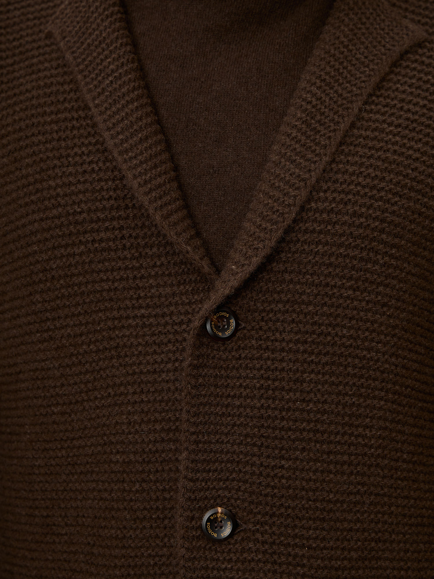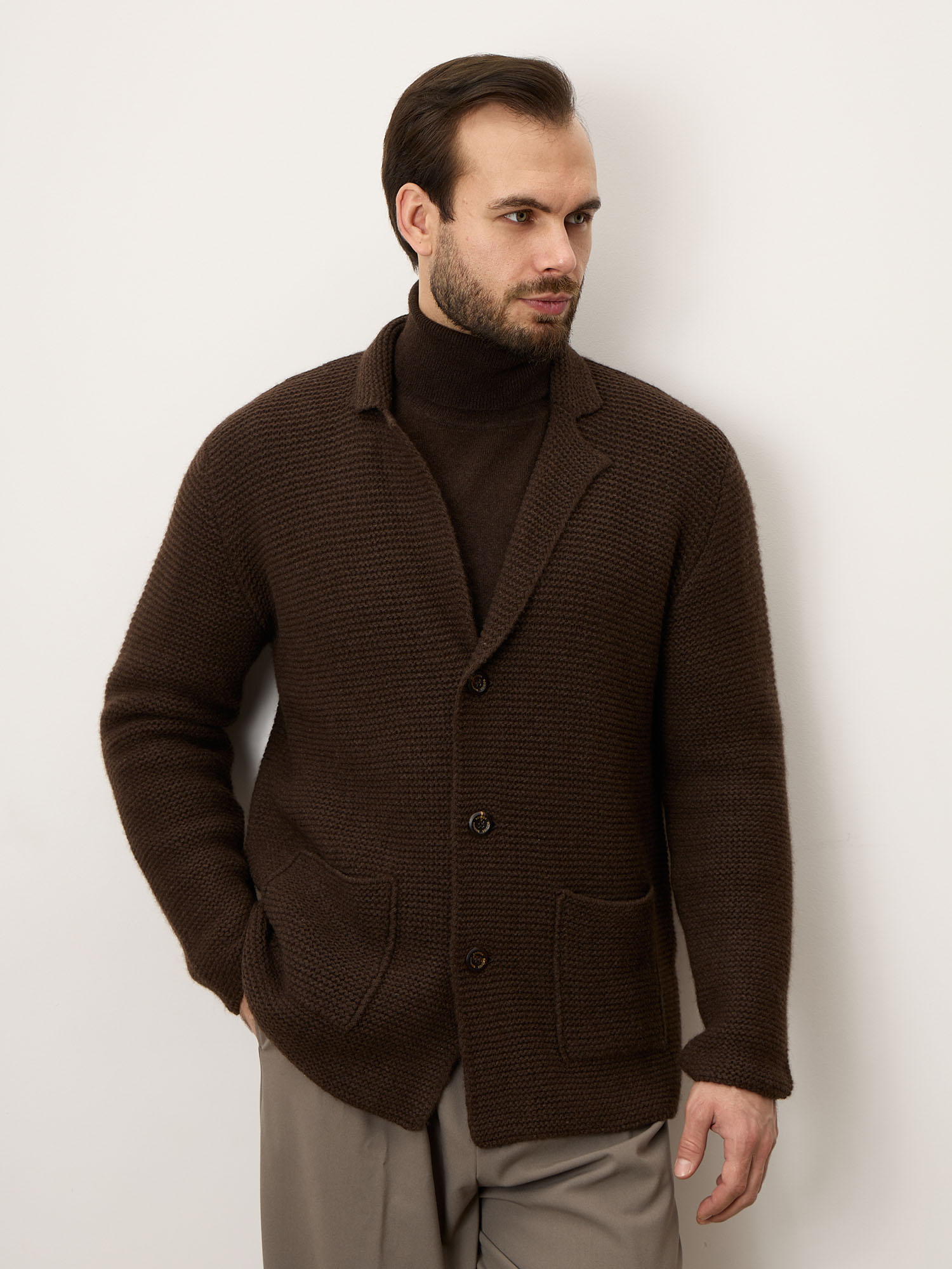 Мужской кардиган из пуха яка в глубоком темно-коричневом оттенке — сочетание элегантности, практичности и натурального тепла. Модель выполнена в классическом стиле с лаконичным силуэтом, что делает её универсальной основой гардероба. Благородный цвет легко комбинируется с базовыми оттенками и подчеркивает статусный, сдержанный образ.
