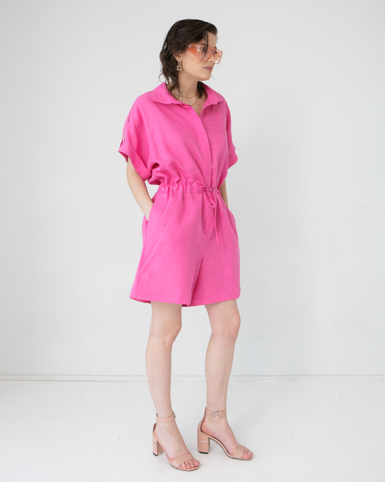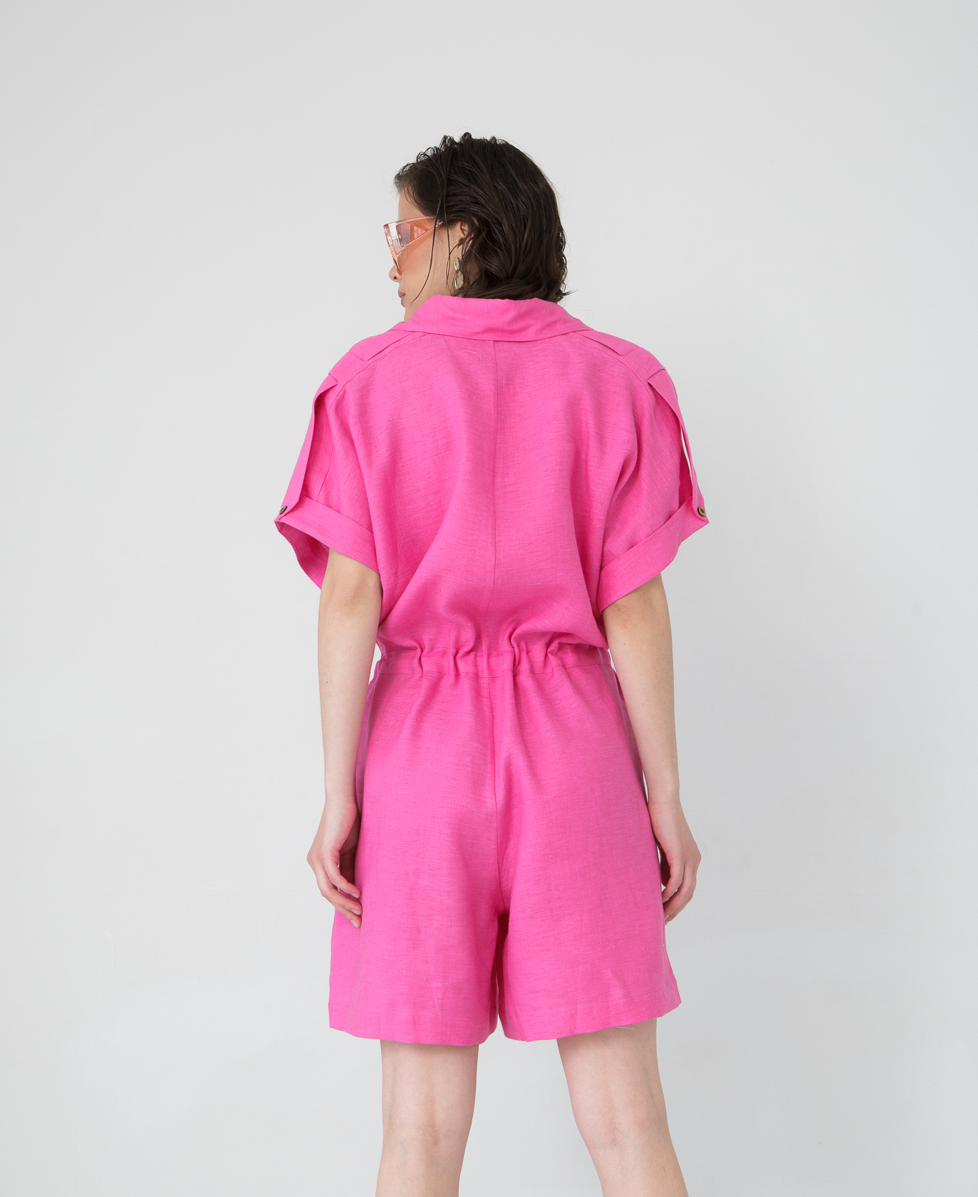 Яркий комбинезон цвета фуксия из 100% льна станет стильным акцентом в вашем летнем гардеробе. Изготовлен из натурального льна, он дарит приятную прохладу в теплые дни и обеспечивает отличную воздухопроницаемость. Свободный фасон с короткими рукавами и шортами позволяет чувствовать себя комфортно и легко, а эластичный пояс с завязками подчеркивает талию, создавая женственный силуэт. Наличие карманов добавляет практичности и удобства в повседневной носке. Этот комбинезон идеально подойдет как для прогулок по городу, так и для отдыха на природе или на пляже.