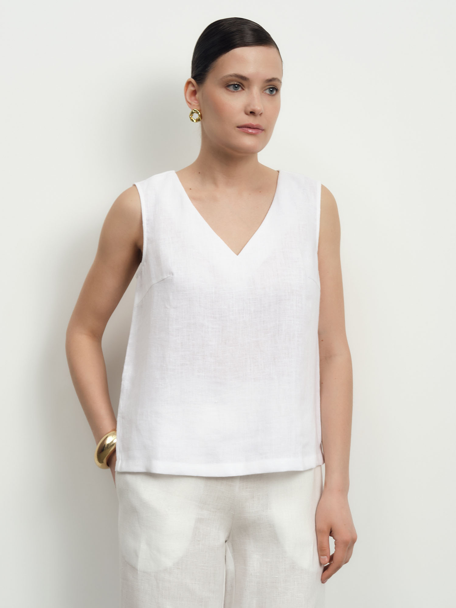 Прямой свободный силуэт без рукавов с аккуратным V-образным вырезом. Лаконичный крой подчеркивает утонченность и современность модели.