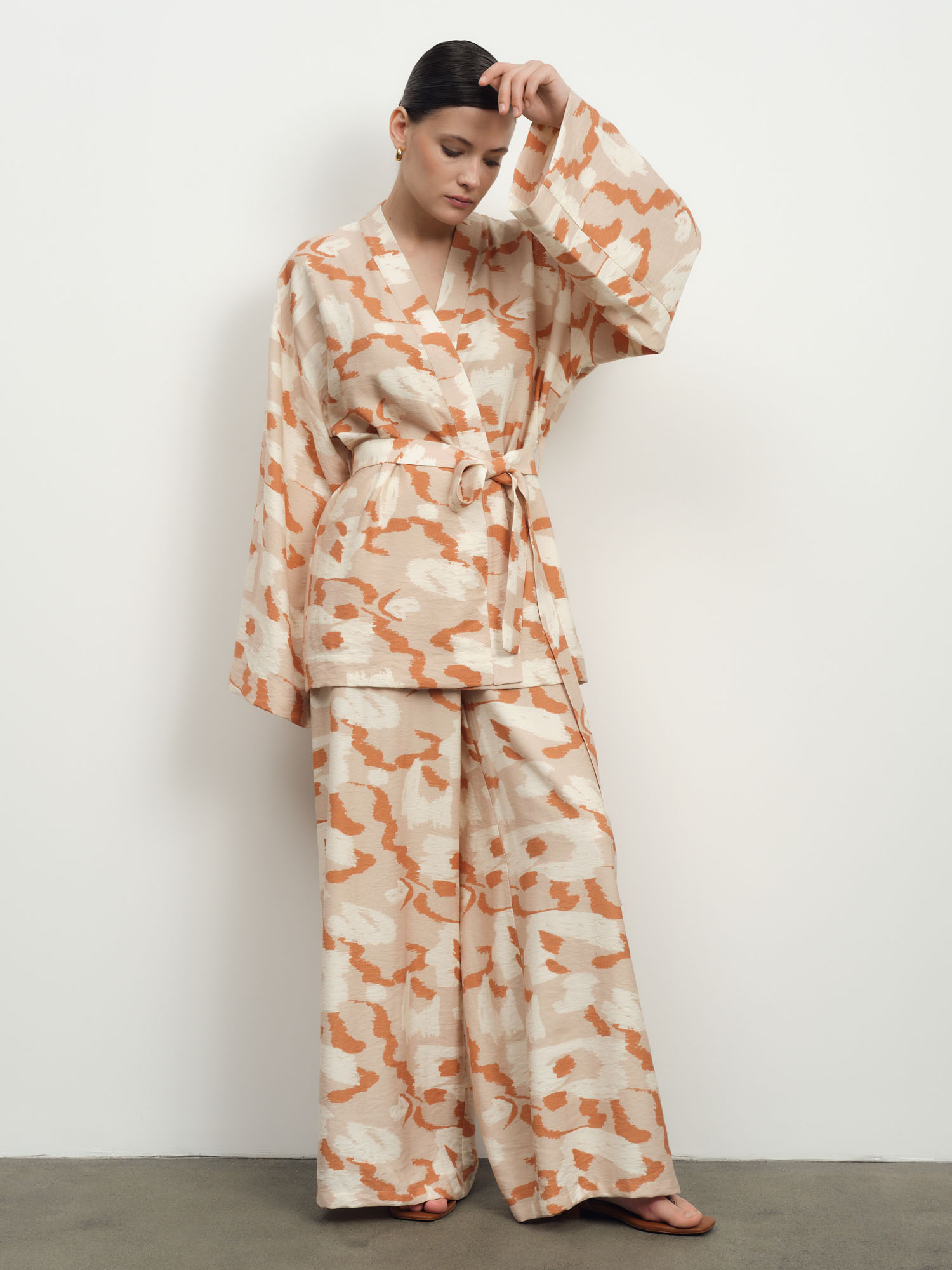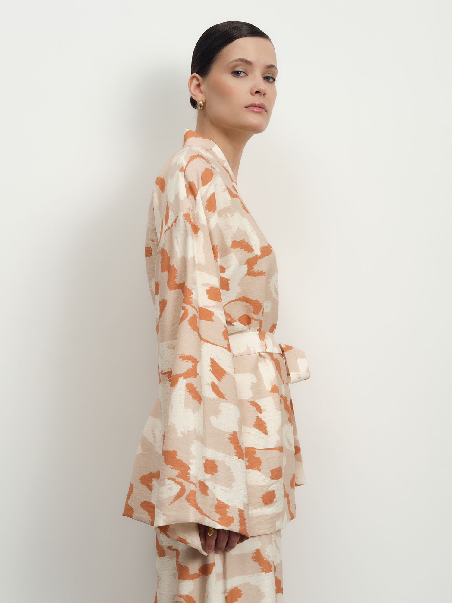 Свободный силуэт в стиле кимоно с запахом. Лаконичный крой дополняется динамичным рисунком, создающим эффектный образ.