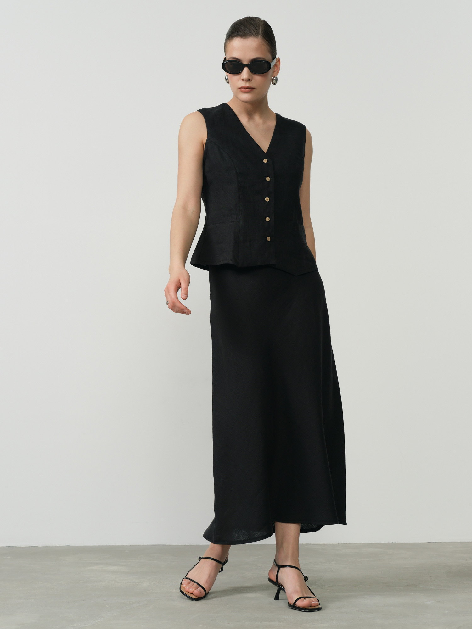 Эта женская льняная юбка в черном цвете станет отличным дополнением к вашему гардеробу. Изготовленная из натурального льна, она обеспечивает комфорт в жаркую погоду, благодаря своей воздухопроницаемости и легкости. Удобная длина миди делает ее универсальной для разных случаев, будь то повседневный выход или деловая встреча. Эластичная талия обеспечивает идеальную посадку и комфорт в течение всего дня. Лаконичный дизайн без лишних деталей делает эту юбку идеальной базовой вещью, которую легко сочетать с любыми топами и обувью. Преимущества льняной ткани включают ее долговечность и стойкость к износу, что делает эту юбку отличным выбором на долгое время.