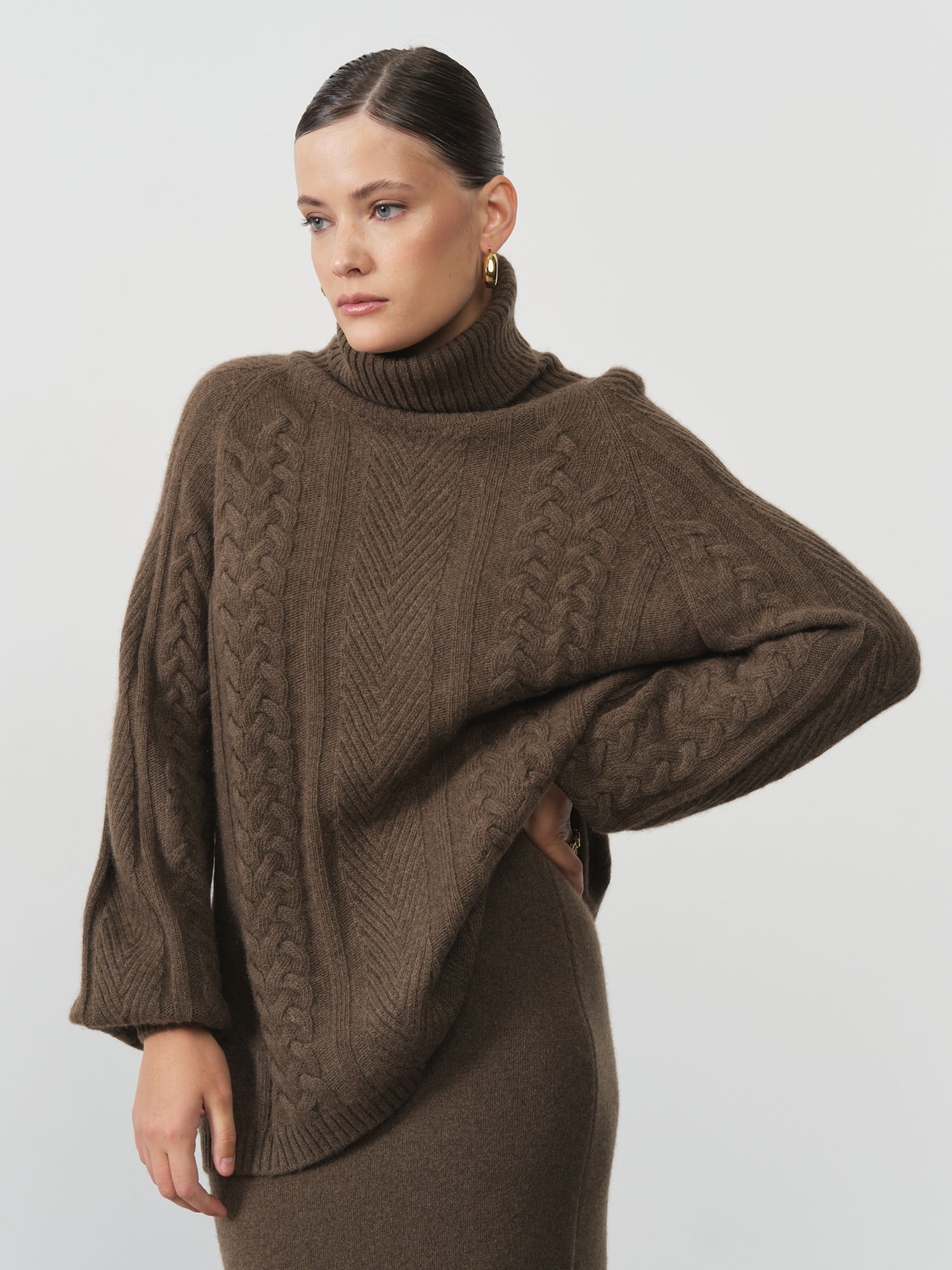 Модель выполнена с высоким воротником и свободным силуэтом. Свитер украшен рельефной вязкой с косами и геометрическими элементами, которые придают изделию объёмную текстуру и выразительный характер.