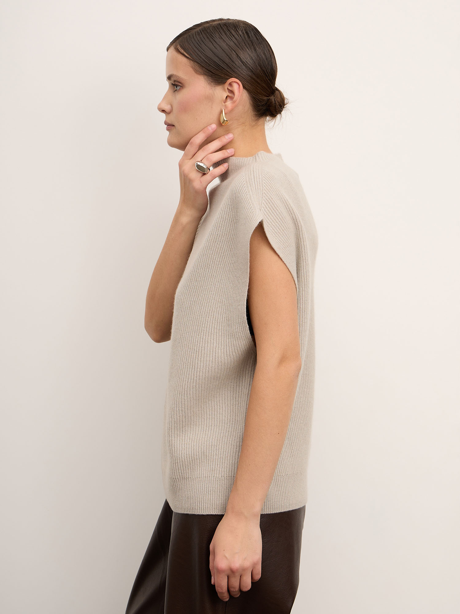 Модель выполнена без рукавов с аккуратным воротником-стойкой и гладкой вязкой. Минималистичный крой подчёркивает благородную текстуру материала и создаёт современный силуэт. Низ изделия оформлен эластичной вязкой, что помогает сохранять форму.