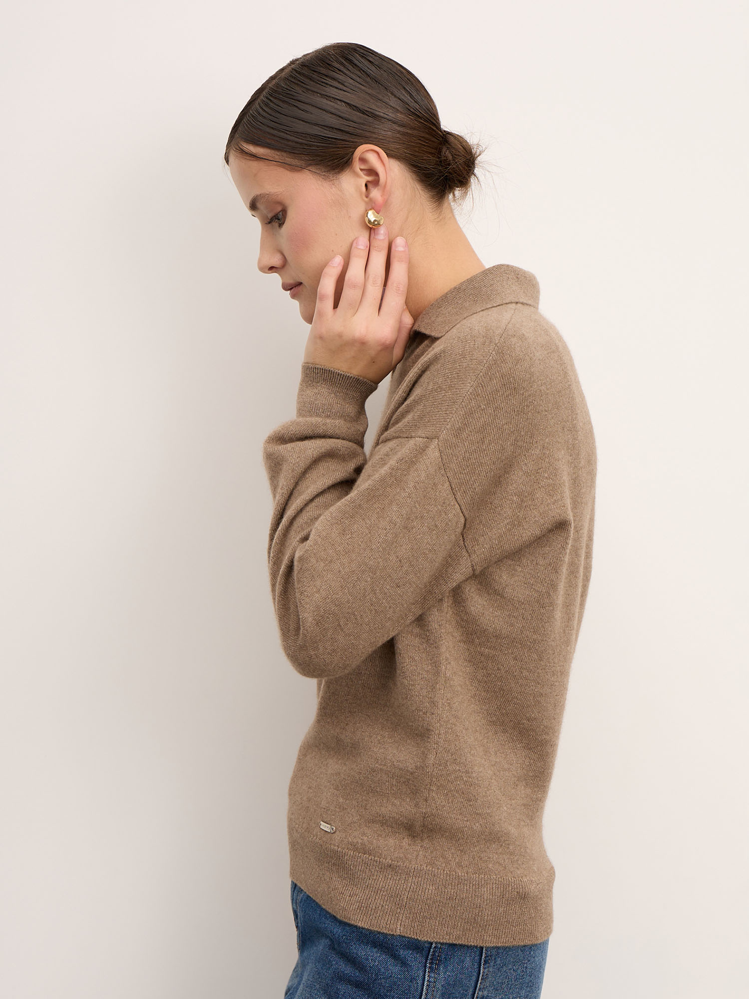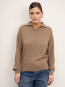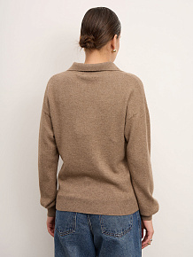 Модель выполнена с аккуратным воротником-поло и лаконичной гладкой вязкой. Свободный силуэт и мягкая линия плеч создают современный расслабленный стиль. Манжеты и низ изделия оформлены эластичной вязкой для аккуратной посадки и сохранения формы.