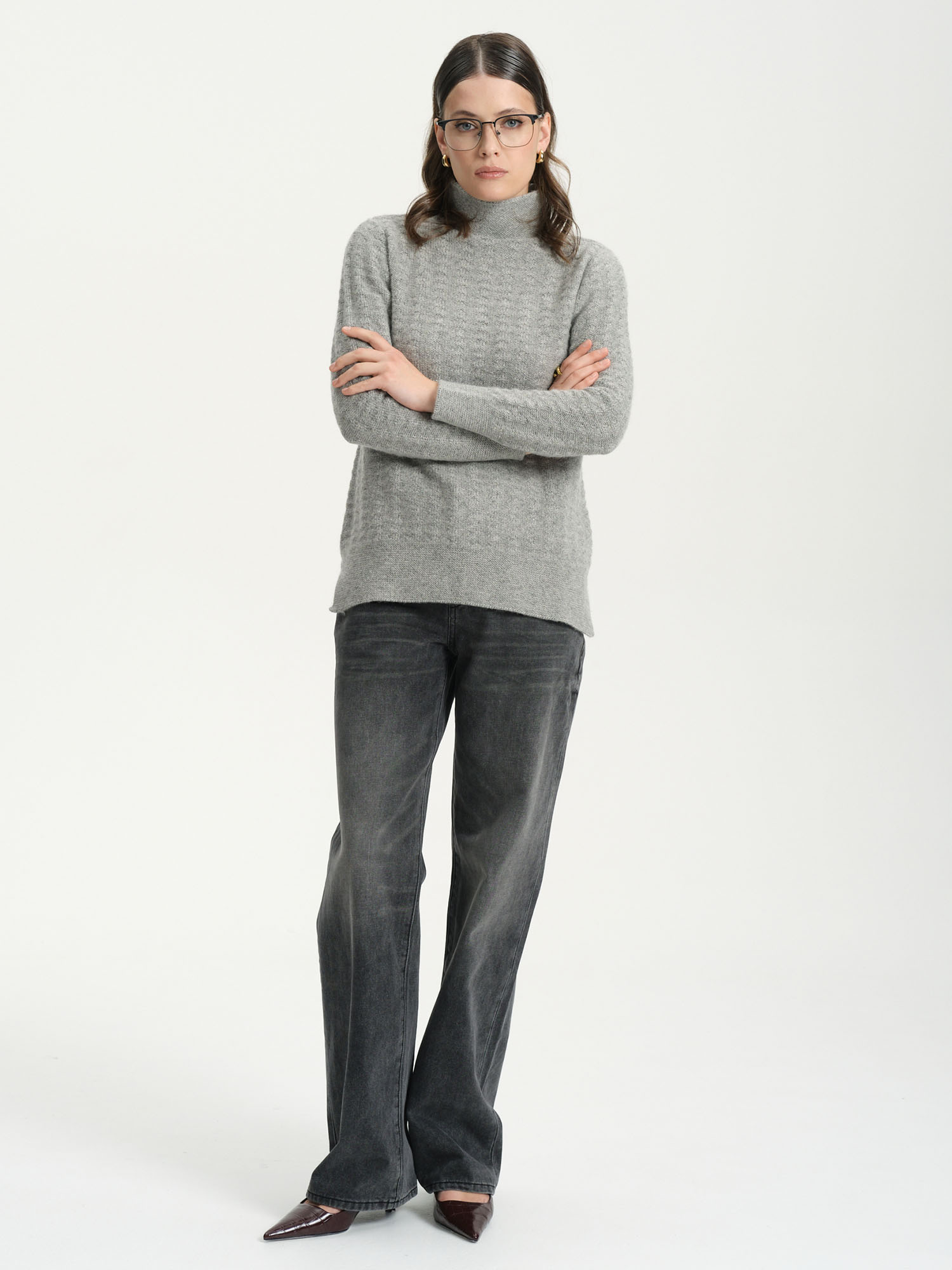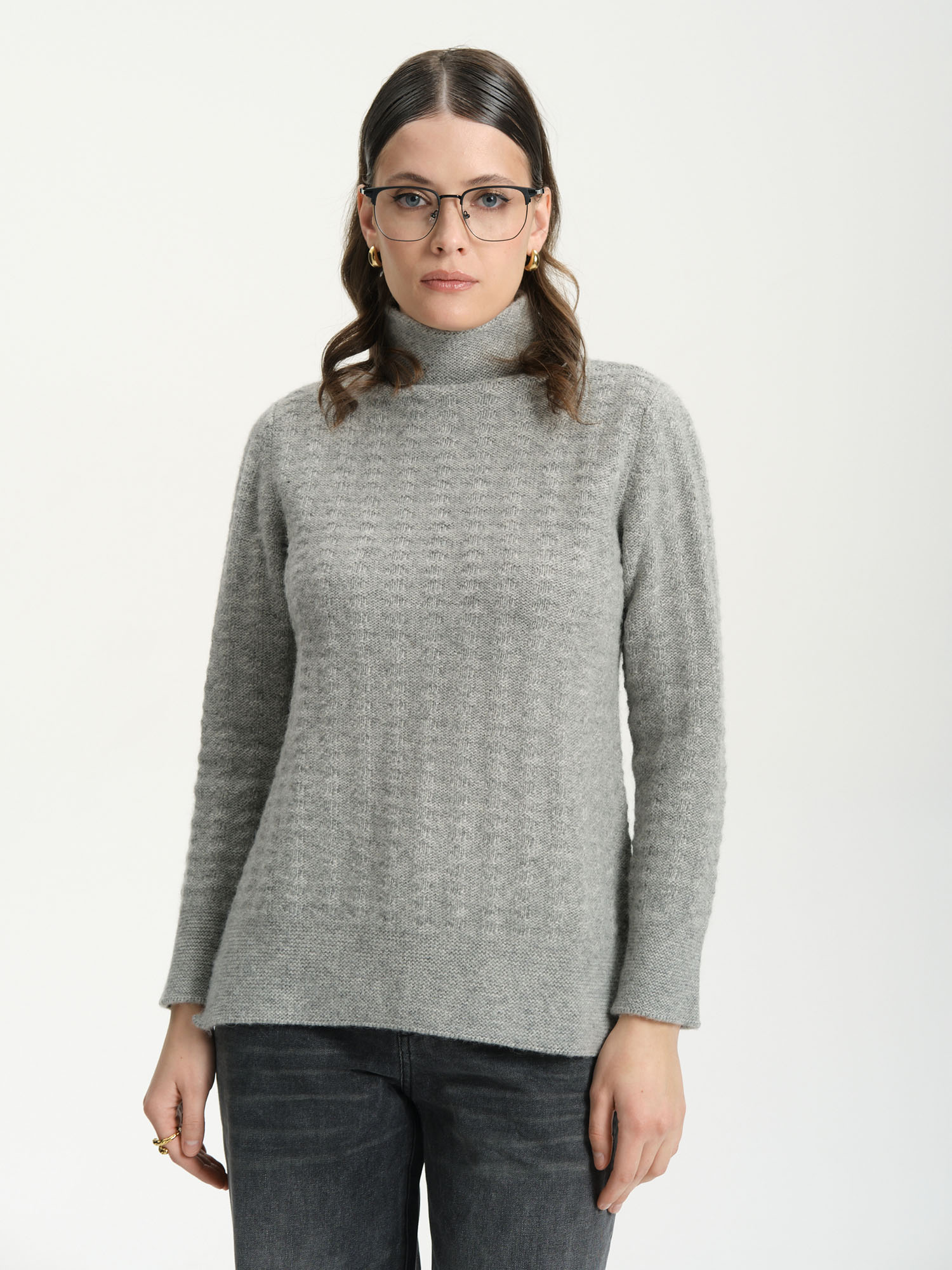 Женский джемпер из натуральной шерсти — практичная и стильная модель для прохладного сезона. Классический силуэт с воротником-стойкой и фактурной вязкой придаёт изделию современный и аккуратный вид. Джемпер легко вписывается в повседневный гардероб и подходит для создания комфортных городских образов.