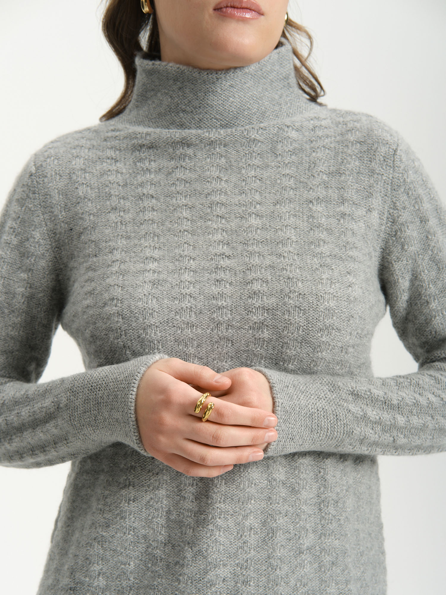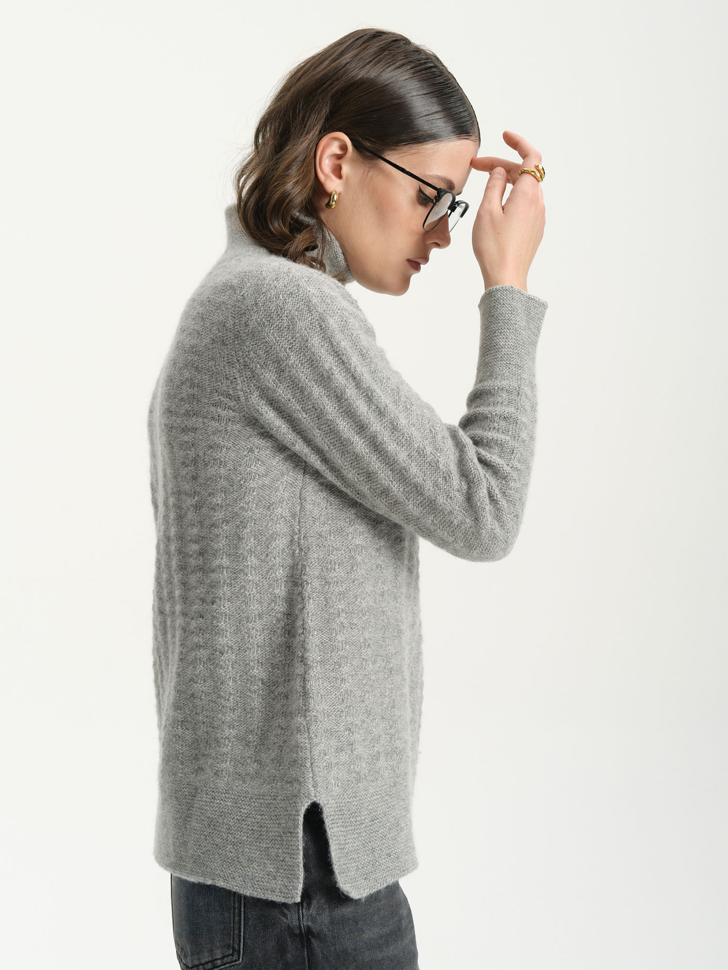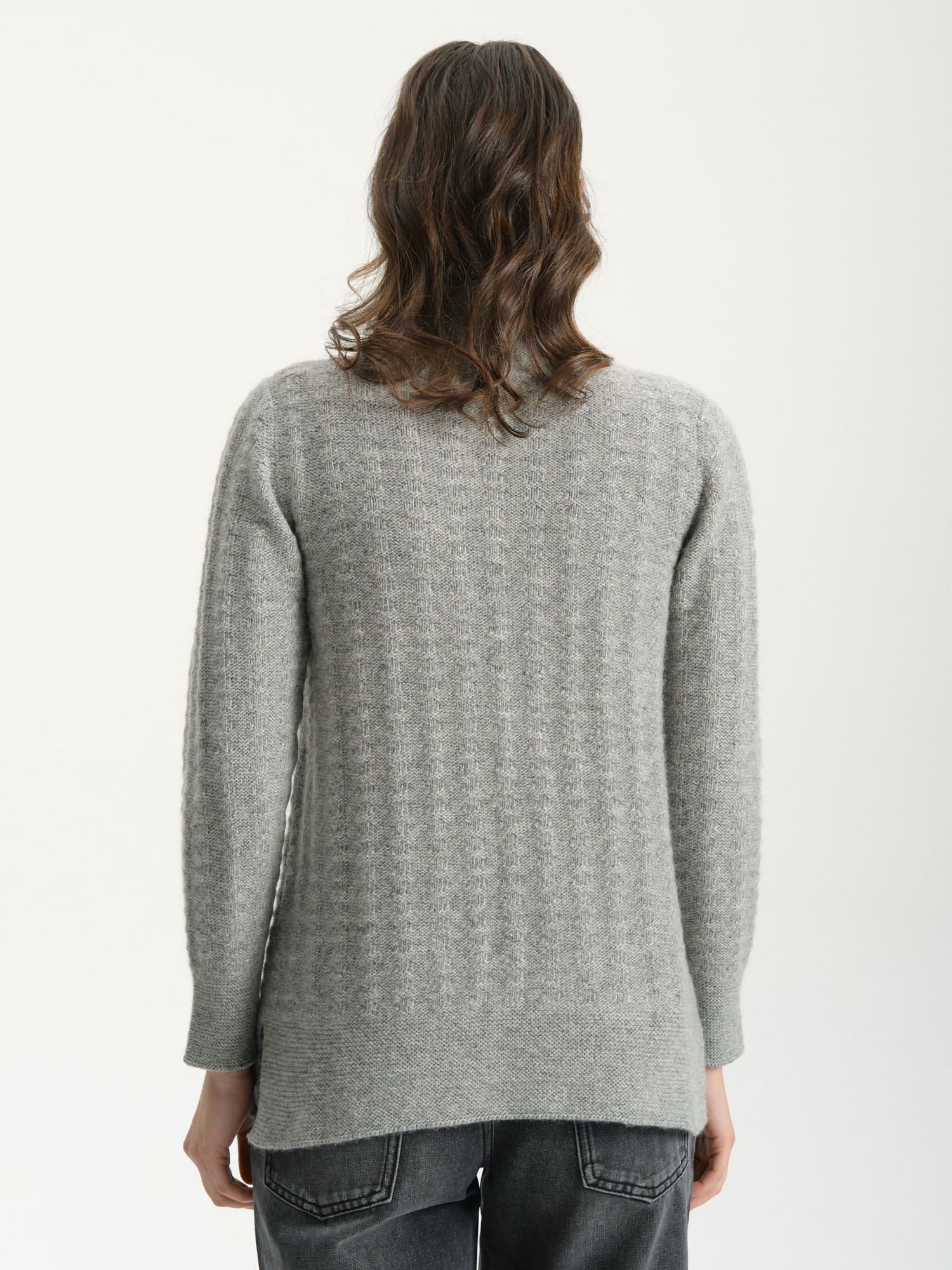 Модель выполнена с воротником-стойкой и фактурной вертикальной вязкой, которая визуально вытягивает силуэт. Лаконичный дизайн делает джемпер универсальным для сочетания с различными элементами гардероба.