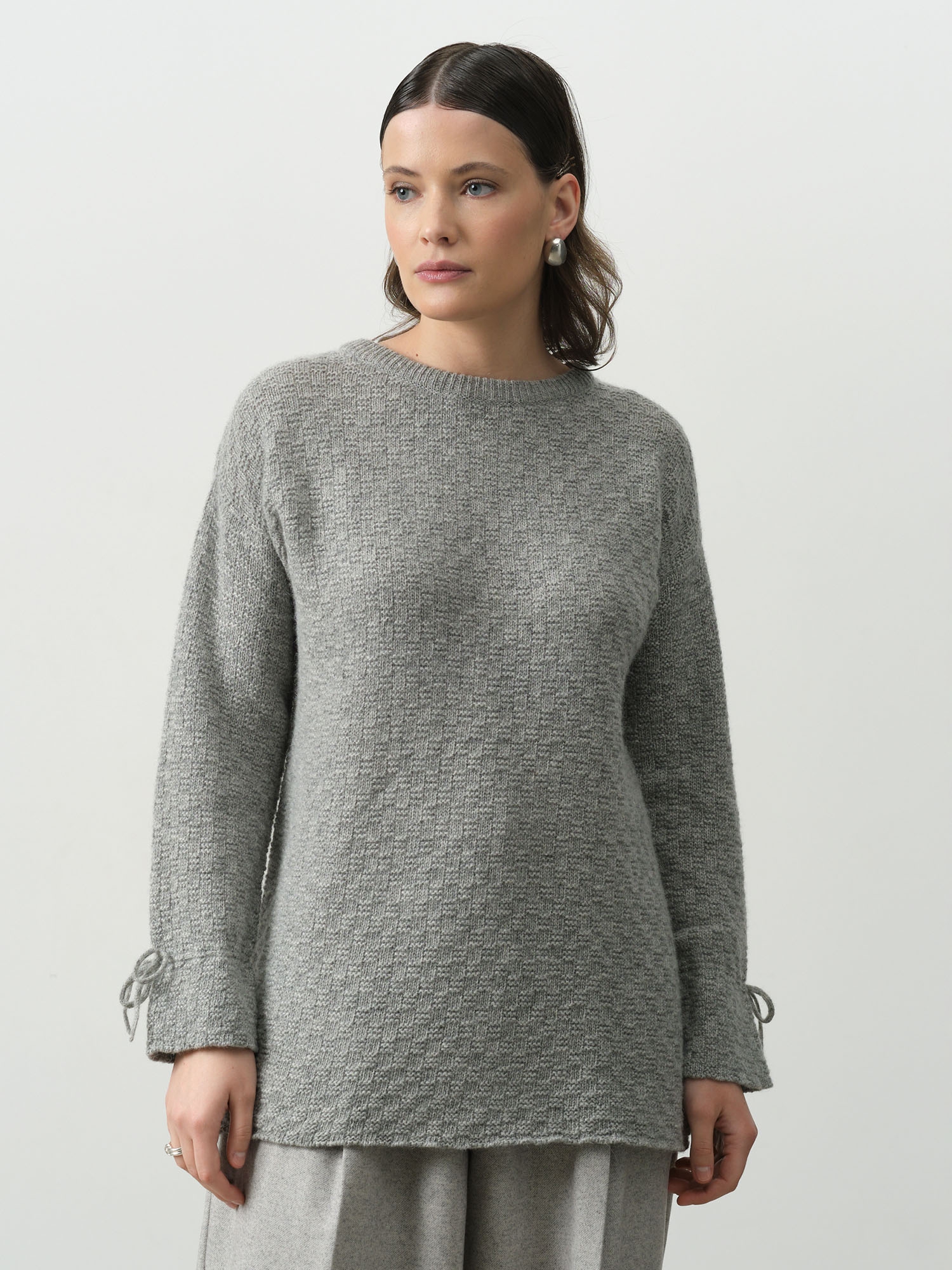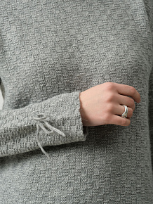 Круглый вырез горловины, длинные рукава с декоративными завязками по низу, аккуратная обработка краёв. Минималистичный дизайн делает модель универсальной для повседневных образов.